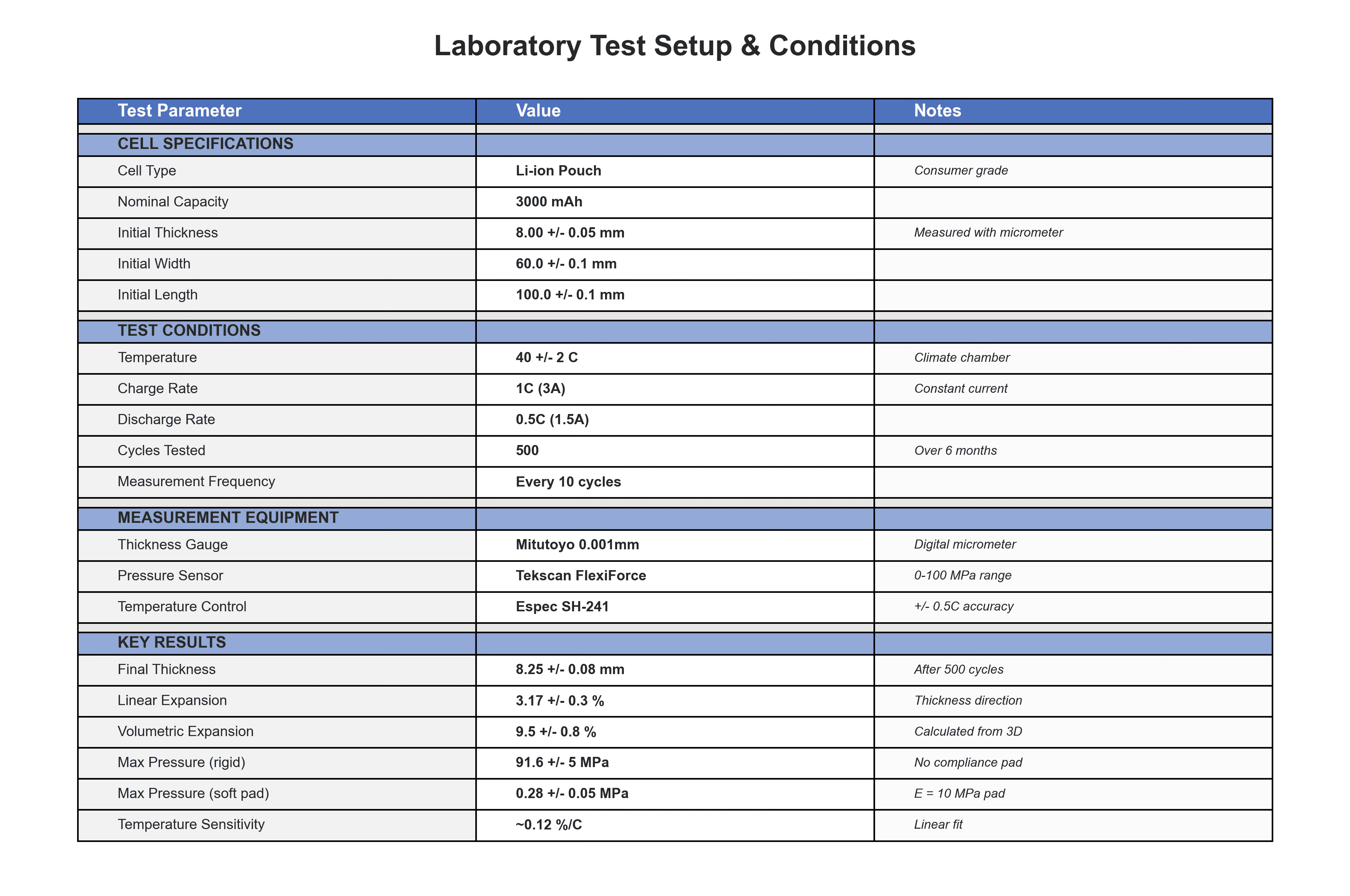 Laboratory Test Conditions: Example test report from cell characterization. This data - 9.5% volumetric expansion, 91.6 MPa pressure under rigid constraint, ~0.12%/°C temperature sensitivity - needs to be translated into FEA boundary conditions and material properties.