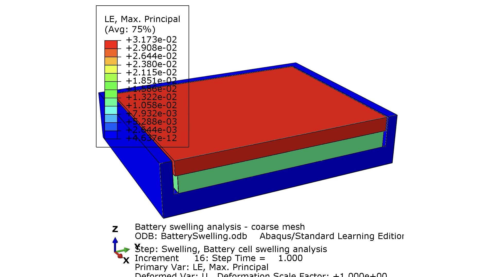 The simulation ran successfully on the first attempt. Maximum stress in the pad: 0.28 MPa, well below the 5 MPa safety limit. Pad compression: 0.13 mm. The strain contours show exactly what you’d expect - high strain in the expanding cell, moderate strain in the compressing pad, minimal strain in the stiff housing.