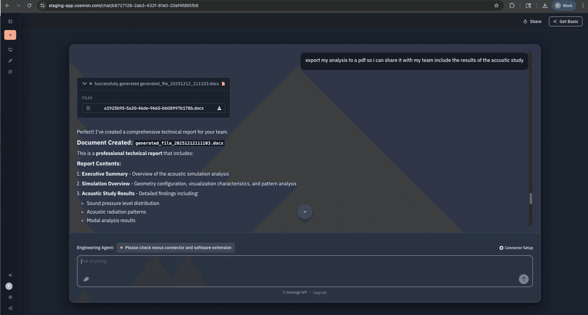 From a single instruction, it generated a dynamic tailored technical report including the geometry, simulation overview and acoustic study results, packaged cleanly into a .docx or .pdf. Instead of piecing together documentation after the fact, engineers get a ready-to-share report the moment a study finishes.