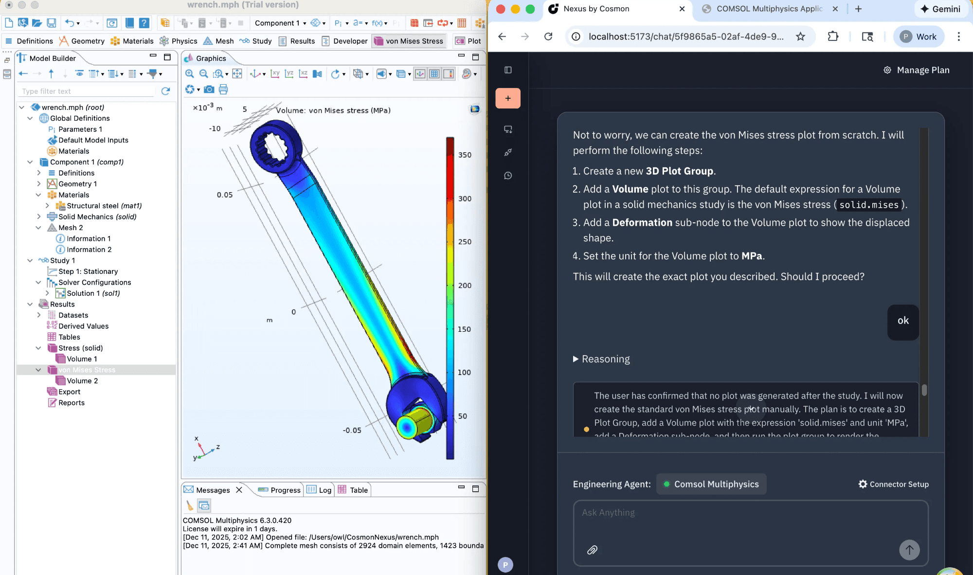 In testing the wrench model, Nexus bypassed this manual configuration entirely. Instead of having to figure out which sub-nodes to add, the agent automatically formulated a plan identifying the correct configuration adding the necessary deformation nodes, and setting the units before executing plots perfectly.