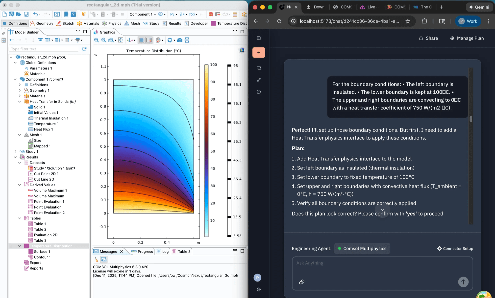 Natural language turns iteration into a conversation. In our 2D heat transfer test, using a single prompt, we defined the complex mixed boundary conditions: “insulation on the left, fixed temperature on the bottom.” Because the setup is text-based, testing a new thermal scenario doesn't require menu-diving; you simply modify the sentence, and the agent reconfigures the physics instantly.