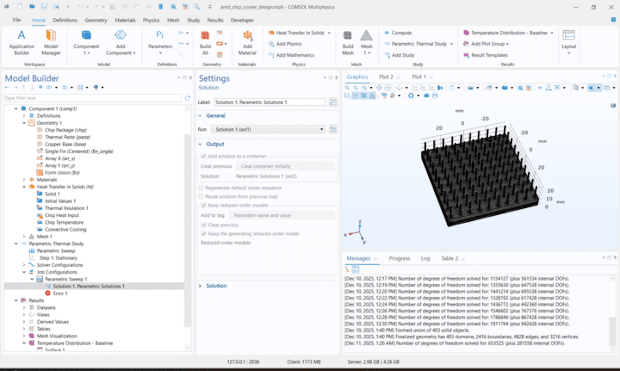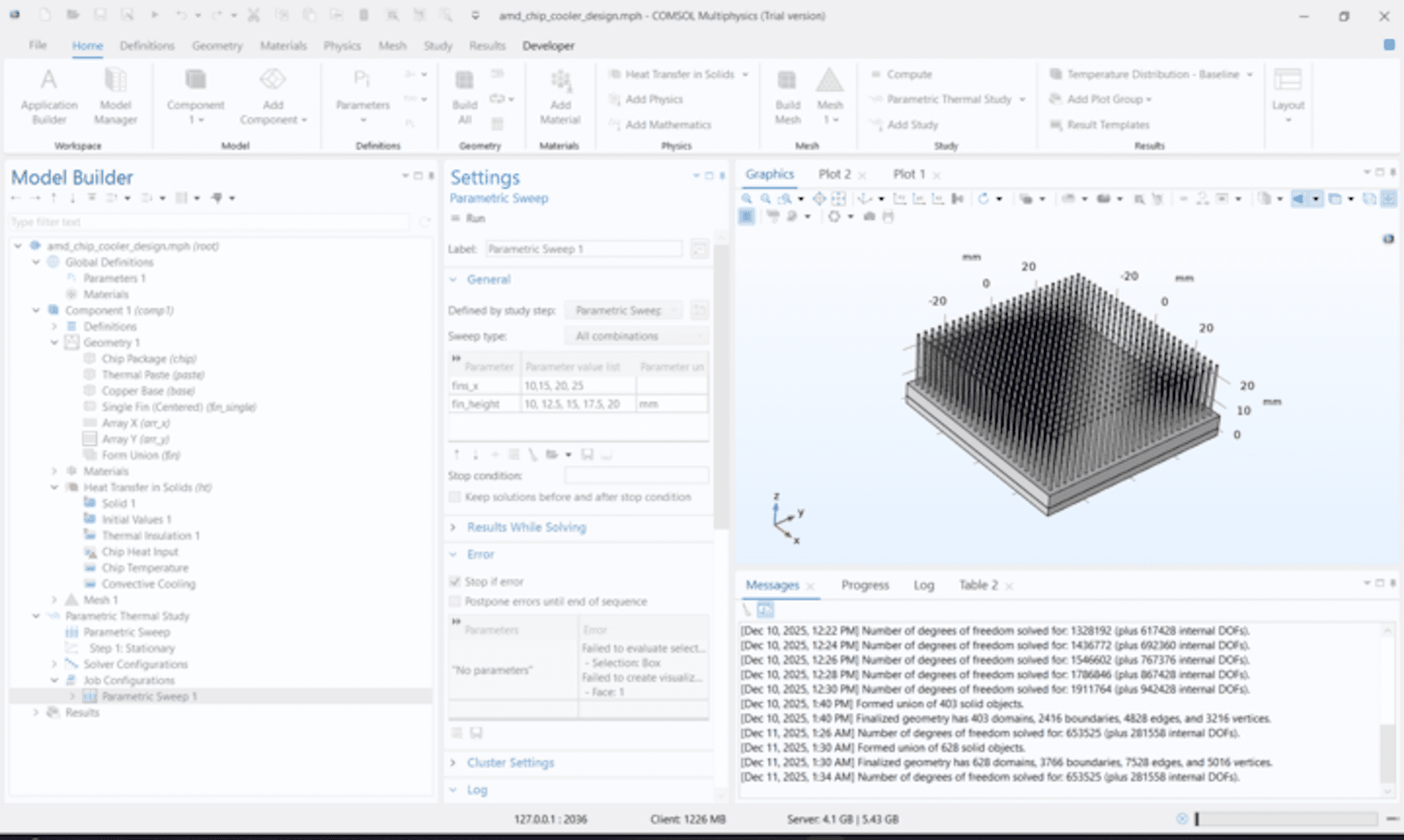 The Sweep: The agent autonomously set up a parametric study to test three distinct configurations: Minimum (100 fins), Baseline (400 fins), and Maximum (625 fins).