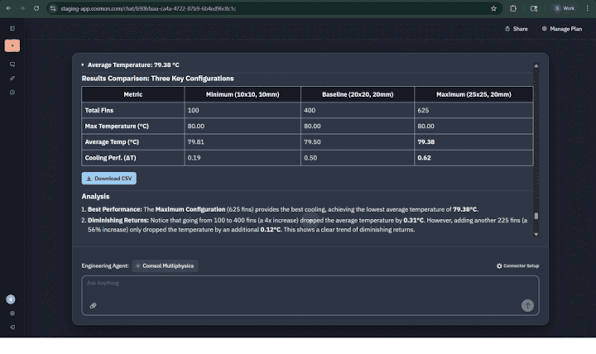 The Insight: Instead of just handing back raw data, Nexus generated a comparative table and identified the point of diminishing returns. It highlighted that increasing the fin count from 400 to 625 (a 56% increase in material/complexity) only yielded a 0.12°C temperature drop.